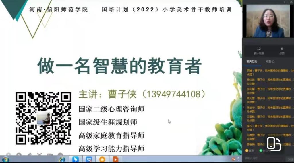 5月28日上午,应365英国上市公司邀请,国家二级心理咨询师,青少年职业发展辅导师、曹子侠老师在线为国培学员做了题为“做一名智慧的教育者”的专题授课,2021年“国培计划”美术骨干教师培训班全体学员共同聆听了本次讲学。