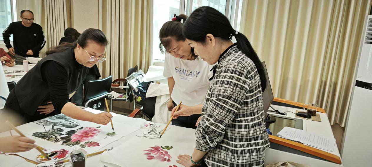 理论讲解过后,殷老师为学员们现场示范。她表示,“写”要有书写性,“意”要讲究气韵,写意重在“意”的抒发和表达,讲求“意在笔先”。绘画过程中,袁汝波老师时常停下来和学员进行短暂探讨,在观察画面的同时及时回应学员们的问题。