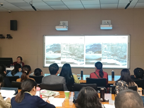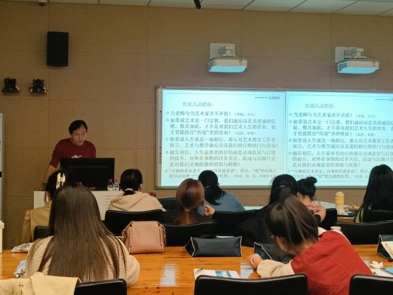 范士轩老师从课前感悟引出“教师与艺术家并不矛盾”的观点吸引在场教师对于山水画的兴趣,后续讲述了学习山水画的好处引出山水画的概念与内容。在讲到绘画创作的基本方法士,他提出创作艺术要进行培养,在进行创作时要对山水画创作中临摹、写生、创作与心源的关系进行深度解剖。