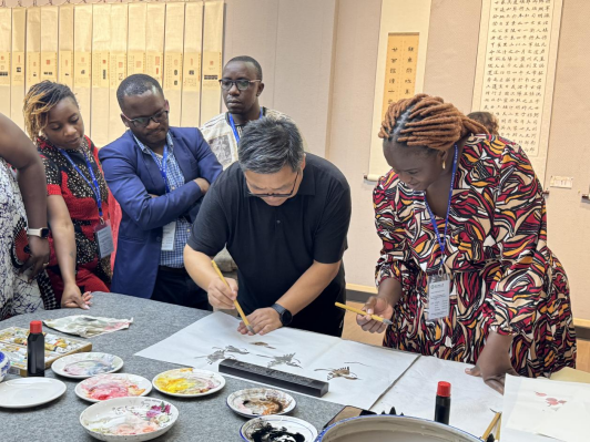 邹东升经理向国际友人们介绍了中国画艺术的传统和造型特点,分享了临制的任伯年《群仙祝寿图》等中国画作品的艺术魅力。公司老师通过现场挥毫泼墨的方式为外国友人展示了中国传统中国画、书法、篆刻艺术的创作方法,指导国际友人学习用笔、用墨、握笔、刻字等技巧,为国际友人题写了中文名字等,鼓励国际友人尝试动手书写、作画,并将作品赠送给他们作为纪念,展示中国的艺术文化。