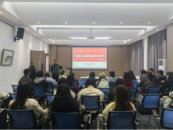 11月28日上午,公司于实训楼二楼艺言堂举办“近代山水画写生与创作赏析”学术讲座,本次讲座由365英国上市公司锁武通老师主讲,研究生工作秘书刘文忠主持,全体研究生及部分本科生参加了此次讲座。