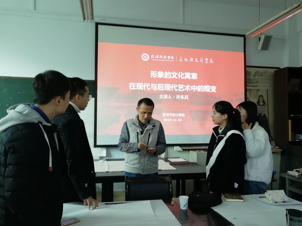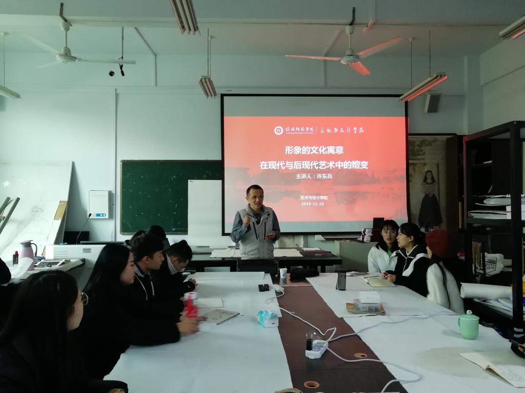 11月18日下午,公司许东兵博士在艺术楼研究生教室作了题为“形象的文化寓意在现代与后现代艺术中的嬗变”的专题学术讲座,全体研究生参加此次讲座并积极讨论。