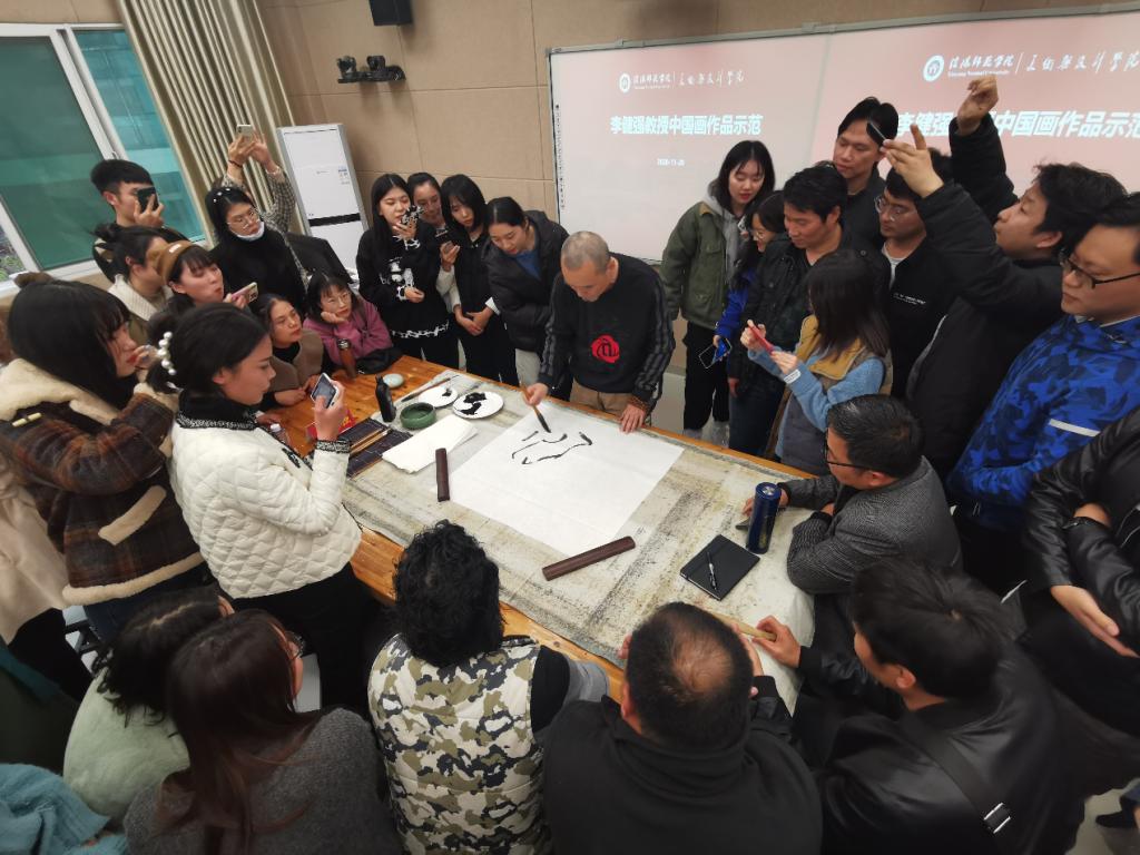 此次示范,现场气氛活跃,同学们不仅开阔了眼界,增强了对山水画的认识,也为同学们创造了一次与李健强教授互动学习、共同研究的机会,充分调动了大家学习山水画的积极性。