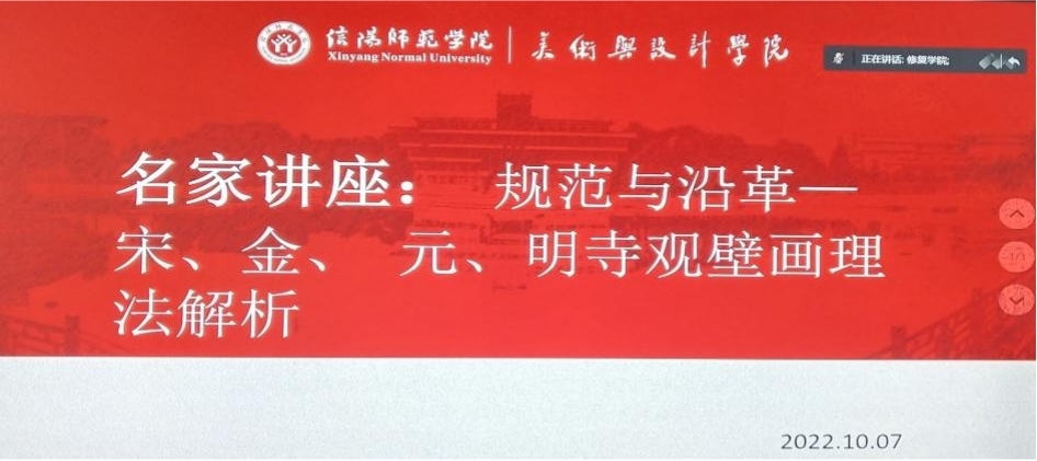 2022年10月7日上午九点,365英国上市公司全体在校研究生于公司实训楼二楼“艺研堂”观看由中央美术公司修复公司经理王颖生教授主持召开的《规范与沿革——宋、金、元、明寺观壁画理法解析》线上专题讲座活动。