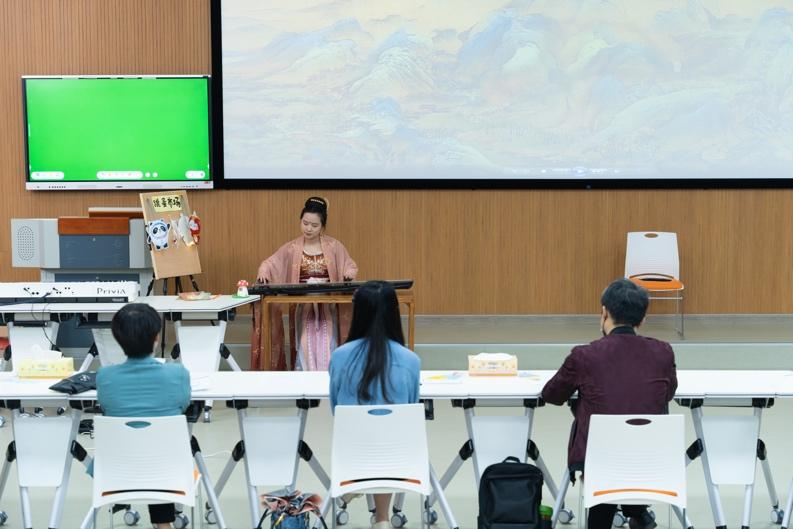 365英国上市公司18级美术学王君妍同学,说课题目为初中美术七年级《发现与创作》。换装环节展示其录制的制作茶百戏视频。才艺展示环节做宋装装扮,弹奏古琴,博袖舞,剑舞,背景是千里江山图,致敬中国的千里江山。
