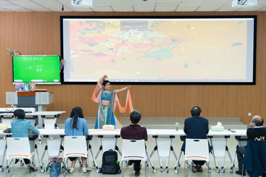18级美术学乔雅涵同学,说课题目为小学美术五年级《唱起来,跳起来》,才艺展示环节做盛唐敦煌飞天造型,结合河南卫视的龙门飞天舞的十三位舞者、神舟十三号,致敬中国航天梦。