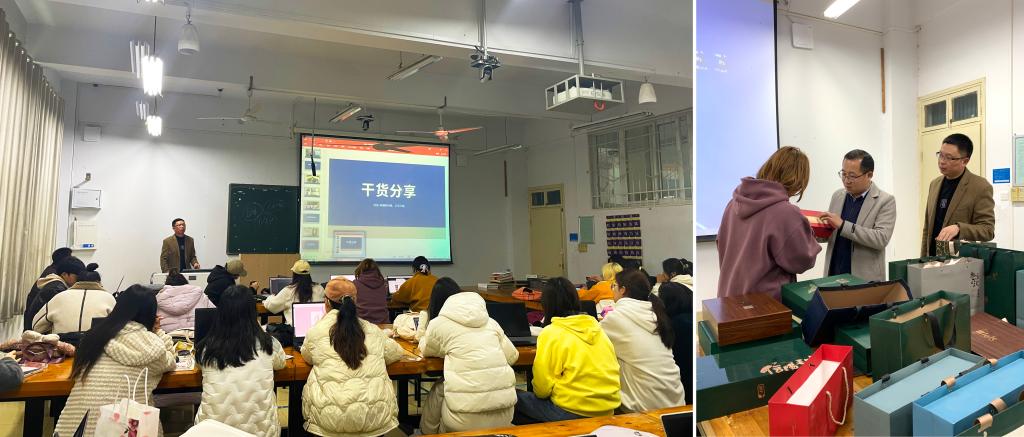 徐锋从传递品牌价值、塑造品牌形象与打造差异化视觉识别力三个方面分析了包装与品牌的关系,并对包装的色彩与元素设计、材质与结构设计进行了案例讲解。在互动环节,随机选取员工挑选自己喜欢的礼盒进行材料与工艺的讲解,徐锋进行纠正和答疑。