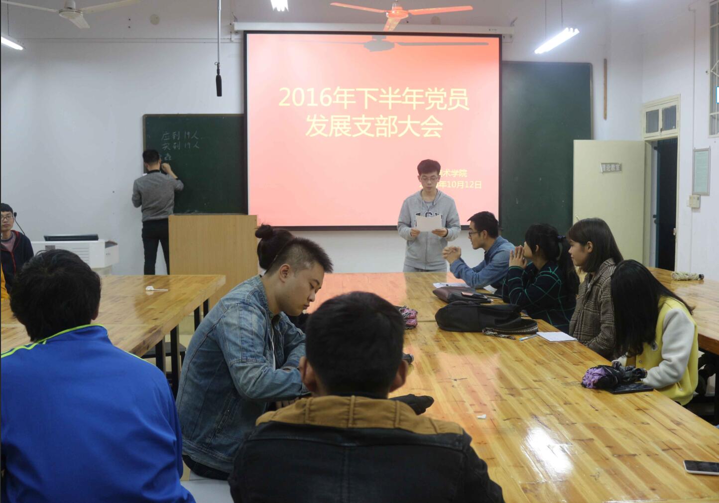10月12日晚,美术公司2016下半年党员发展支部大会在艺术楼217、306、307、308四个教室同时进行。美术公司辅导员张锐、施远,美院员工会主席薛宇及其他党小组成员出席了此次会议。