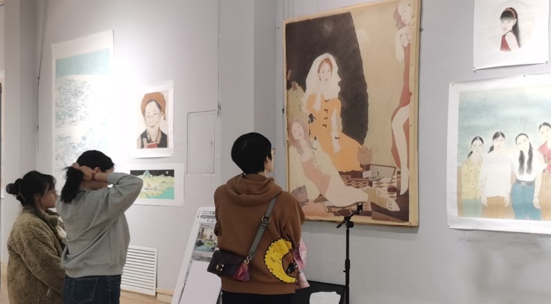展览期间,同学们互相欣赏画作,仔细观察他人的优秀作品,学习绘画方法,实现同成长、共进步。本次展览中的作品运用了多种技法和肌理。形式多样性,手法新颖,题材内容源于生活而又高于生活,从中可以看到他们在表现形式上的初步探索和寻求艺术观念变更而进行的新的尝试。