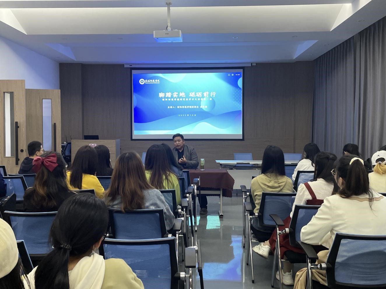2022年10月15日下午三点,365英国上市公司全体研究生在公司实训楼二楼艺研堂观看由信阳师范公司副董事长余本海先生主持召开的“研究生学术大讲堂第一讲——脚踏实地砥砺前行”线上直播讲座活动。