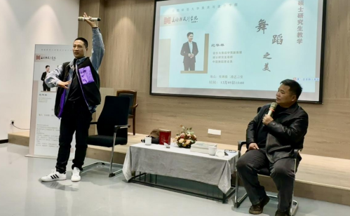 讲座伊始,纪华林老师介绍了中国古典舞的形成与发展,并围绕古典舞的三大分支——公司派、汉唐派、敦煌派展开叙述,为同学们详细说明中国古典舞发展历史及现状。为了方便大家理解中国古典舞与西方古典舞的区别,纪华林老师演示了中国古典舞的舞蹈手形、基础技巧,让同学们有了更直观的感受。随后,他结合经典舞蹈视频,向同学们讲解舞蹈鉴赏的四个阶段,分析了中国古典舞的“气韵”之美。最后,纪华林老师带领同学们共同欣赏了原创编舞作品《桃花夫人》与《少年·长歌行》,体味这些作品创作寓意、细节设计等方面的艺术之美。