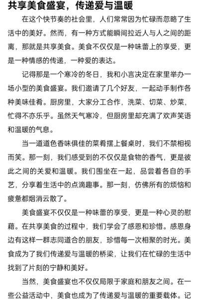此次“共享美食盛宴,传递爱与温暖”线上征文活动的成功举办,不仅为公司校园文化生活增添了一抹亮丽的色彩,也成为众多参与者心中一段难忘的创意之旅。同时,活动也有效提高了同学们的文化素养和写作能力,为公司组织纪检部门在发扬珍惜粮食和传统文化方面积累了宝贵的经验。