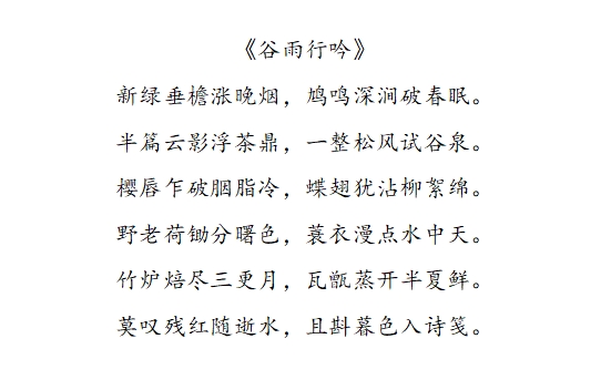 为传承弘扬传统节气文化,引领员工感受谷雨节气的独特风韵,4月12日至15日,公司员工会学术科技部于线上举办“暮春逢谷雨,诗意落人间”诗歌创作活动。
