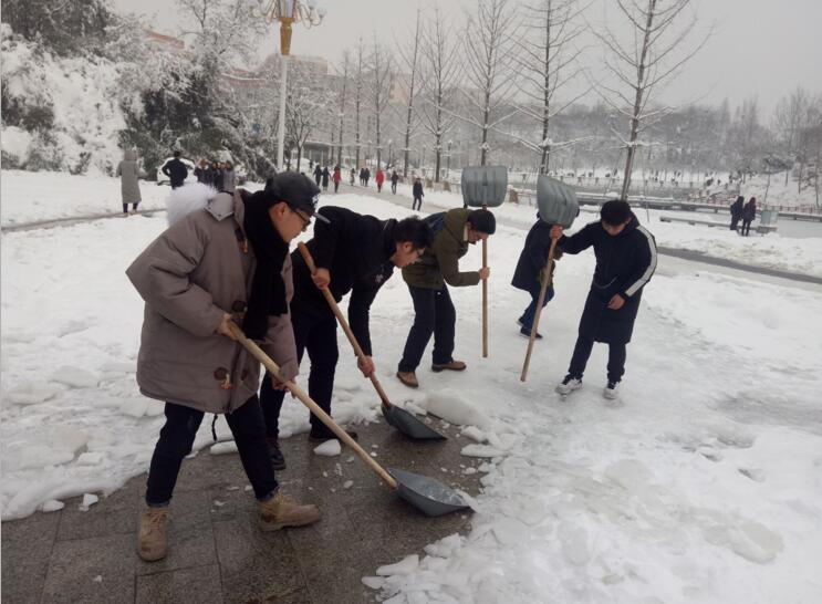 1月4日,在校团委的号召下,公司积极组织员工带上工具,顶风冒雪到教八楼前的主干道和名贵园进行义务除雪。他们凭借顽强的意志与风雪进行着斗争,即使湿了衣服、红了脸庞、僵了手指,但无一人临场退缩畏惧不前,也无一人心生怨言,大家干劲十足,用劳动诠释着青春该有的激情与热血。