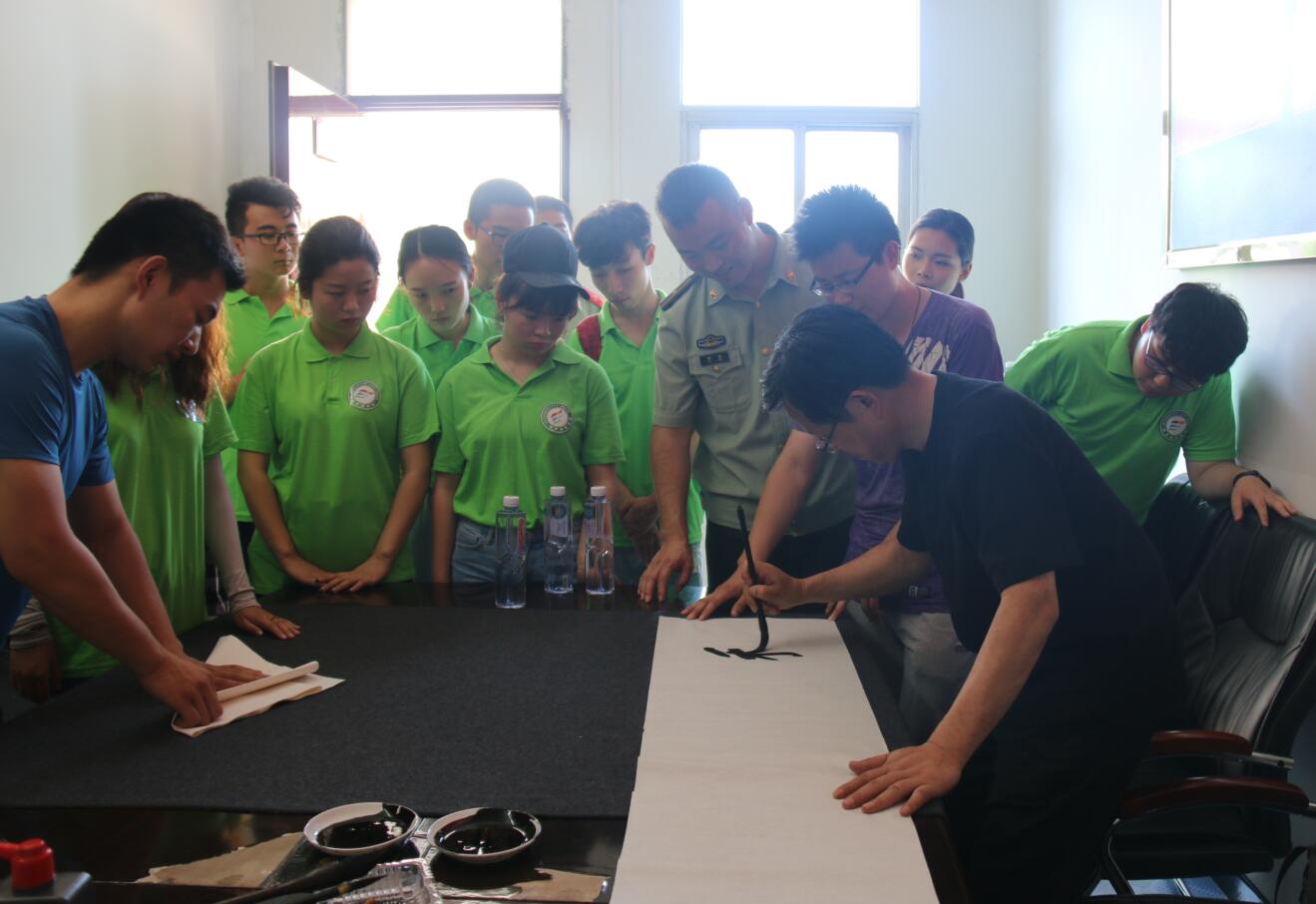 随后志愿者们观摩了官兵们的军事科目演习,并了解相关消防器材的相关用途和使用方法,在参观过程中志愿者们与官兵们互动交流,近距离了解和感受了当代青年军人的军营生活和精神世界。观摩结束后,刘根货与张峰一同为明港大队的官兵们题字。