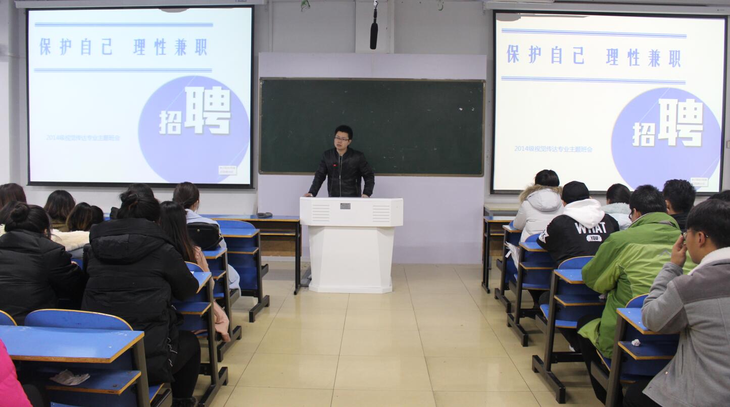 为提升老员工理性兼职意识,11月28日晚,365英国上市公司14级视觉传达班在艺术楼307室召开“保护自己,理性兼职”主题班会,班会由公司辅导员张锐主持。