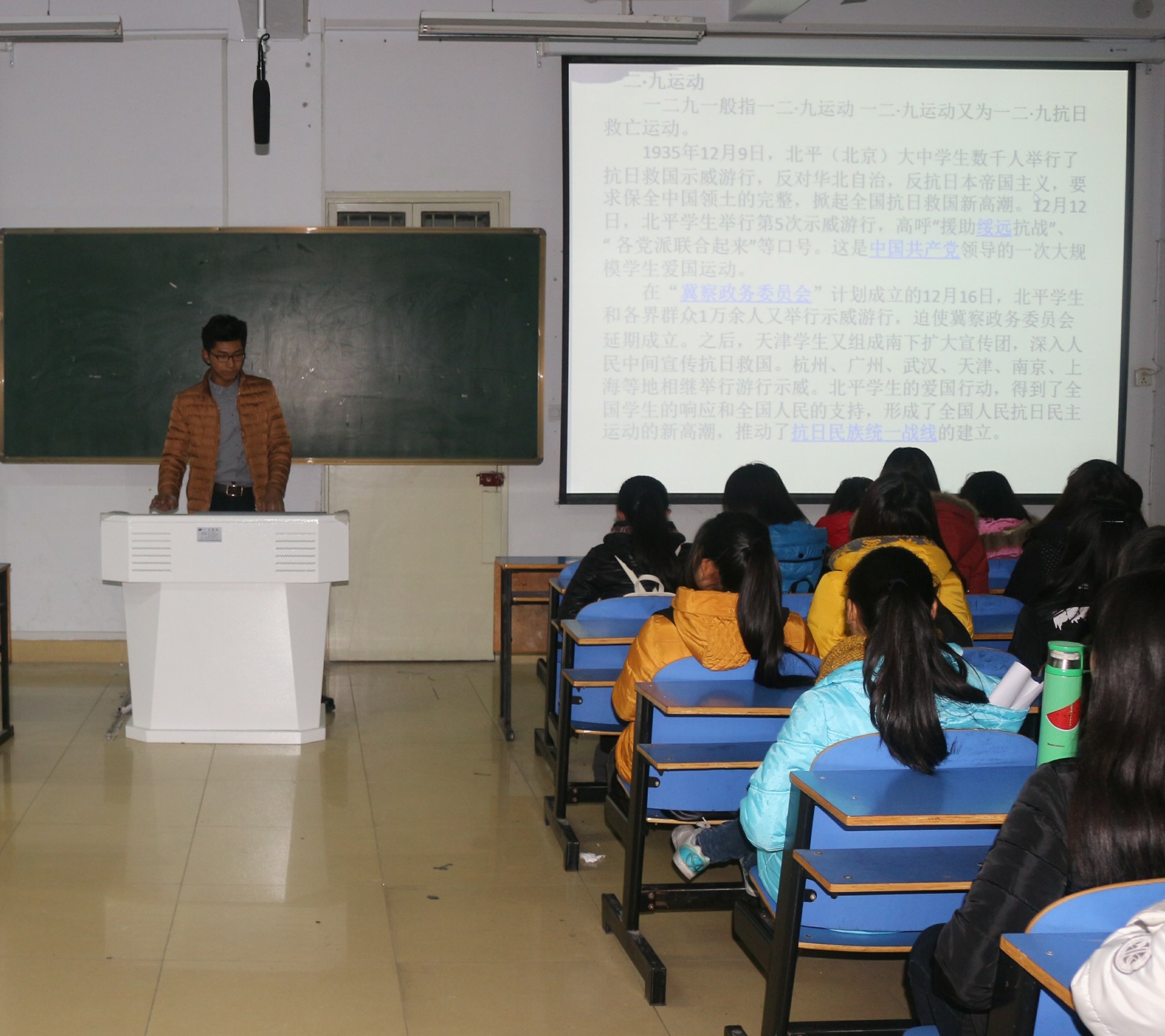 为了让同学们深入了解爱国运动,激发爱国热情,坚定理想信念。12月8日,由美术公司团总支员工会组织的纪念“一二九”运动八十周年主题活动在艺术楼307教室成功举办。美术公司团总支员工会全体成员,2015级视觉传达设计班及绘画班参加此次活动。