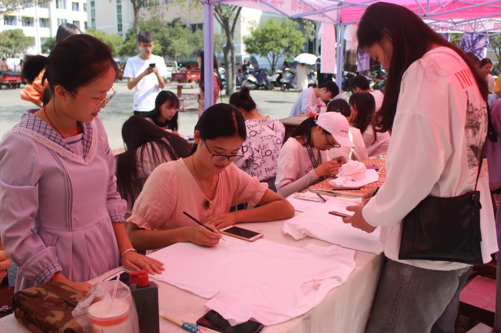 活动前期,相关负责人通过海报、展板、微博等途径进行线上、线下两种方式进行宣传,吸引大批同学前来参加。活动开始后,负责人耐心给同学们讲解活动内容与制作方式,并给同学们分发白衣、宣纸、画笔等创作材料。活动中,同学们尽情的发挥自己的想象力,齐心协力、专心致志的对待自己的作品。一件简简单单的白衣经过同学们的艺术加工过后,变成了承载着对祖国无限爱意的文化衫,一张普通的宣纸,书写着祖国的伟大辉煌。同学们的作品均表达出了对祖国母亲的赞美,以及对中国梦的传扬。不一会,充满创意色彩的作品与周围的小红旗一同在帐篷周围随风飘扬,吸引了众多同学驻足观看,在校园内形成了一道亮丽的风景线,现场气氛好不热闹。期间,公司团委老师郑波亲临现场做指导工作,并对同学们提出鼓励。