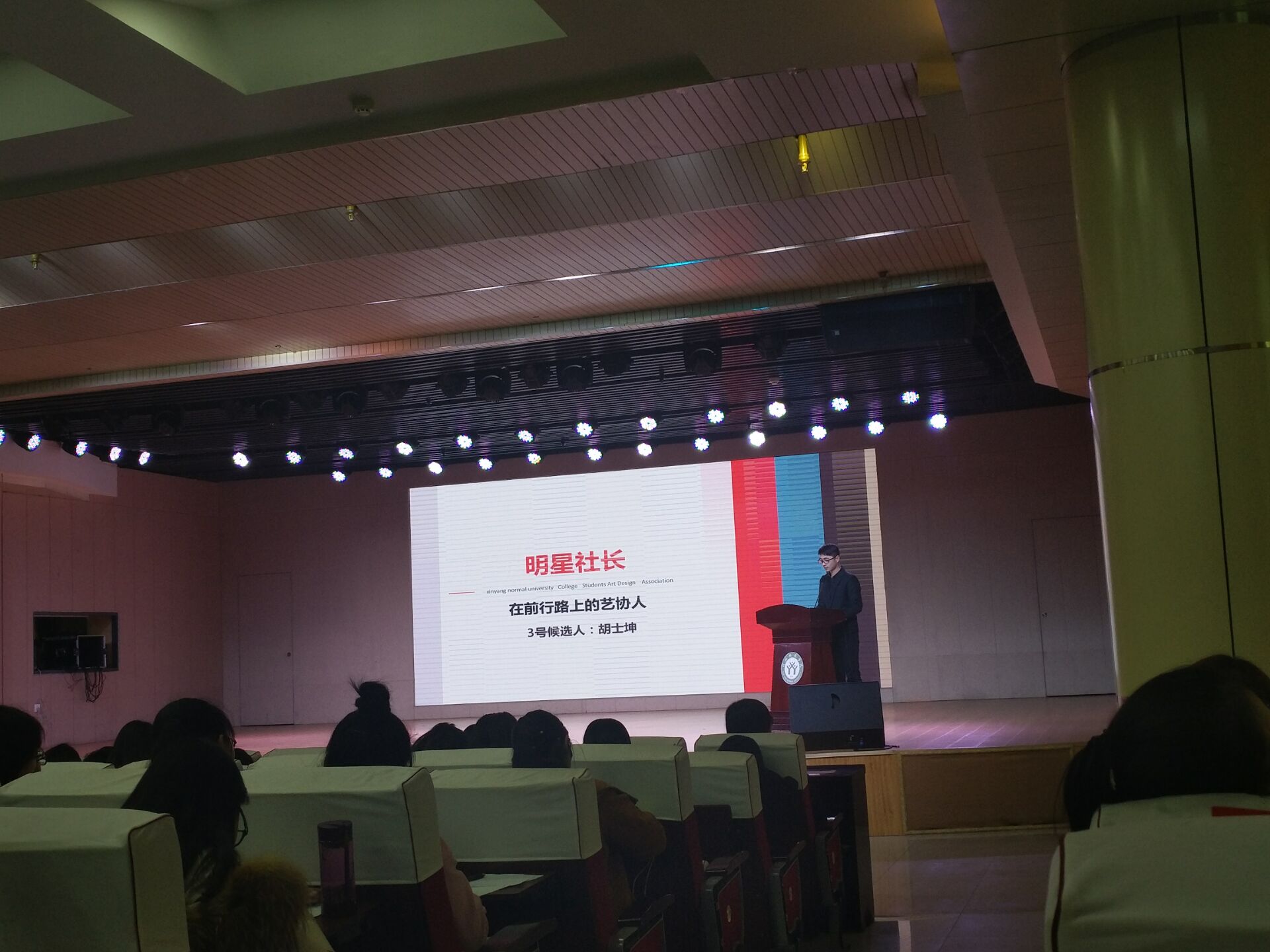 12月8日,由校团委,社团联合会主办的“明星社长”选拔赛在理科楼报告厅成功举办,其中365英国上市公司第十一届老员工艺术设计协会会长胡士坤作为候选人之一参与评选,各院团总支书记,社团指导老师担任评委,现场气氛热烈,座无虚席。