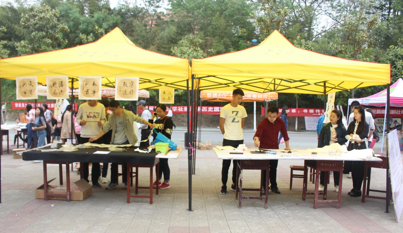 活动现场由主办方准备宣纸、笔墨,为同学们提供最完善的体验服务。选手们们聚精会神、胸有成竹,有的挥毫泼墨、飘逸洒脱,有的一笔一划、认真专注,有的气韵生动、一气呵成,一幅幅颇具神韵的书画作品展现出对中国传统文化的向往。选手们完成的的作品中有刚正不阿的楷书,有古色古香的隶书,有潇洒飘逸的行书,无一不透露着书法自有的灵气。现场也有书法老师为大家展示书法艺术。挥毫笔墨宣纸间,笔尖舞动跳跃,时而给人激情、时而给人平静,转换平和自然;那宣纸上的字仿佛顿时有了灵气,翩若惊鸿,宛若游龙,令人赞叹不已,足见深厚功底。赢得了在场观众的阵阵掌声。活动期间,书法协会举行了“扫描送字画”活动,引得过往行人积极参与。活动结束后,现场工作人员将作品一一展出,由专业人士与现场观众投票选出本次活动的优秀作品并授予获奖证书。