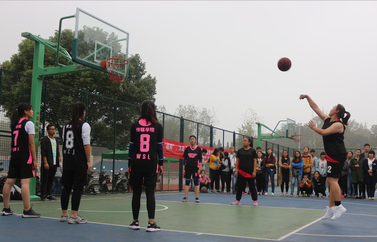 为丰富大一新生的课余生活,增强集体凝聚力,信阳师范公司第九届“朝阳杯”篮球赛在西篮球场火热开赛,美术公司首战传媒公司。 男子组篮球赛首先开赛,随着裁判一声哨响,比赛正式拉开帷幕,双方队员迅速进入状态,随即展开激烈的对攻。公司队员们用敏捷的抢球、快速的断球、猛烈的进攻,赢得了场上阵阵掌声,对方也毫不松懈,几记罚球拉开比分。上半场结束时,公司暂时处于下风。下半场开始,公司队员改变战术,结合上半场的经验,迅速反击,队员进行一对一盯防,比赛进入白热化阶段,我方队员丝毫不敢放松,以扎实的球技,敏捷的身手,渐渐将比分拉近。