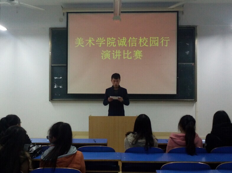 11月22日,由信阳师范公司美术公司团总支员工会举办的“诚信校园行”老员工演讲比赛在艺术楼307教室拉开帷幕。各年级经选拔的三十余名同学参与了此次演讲比赛。