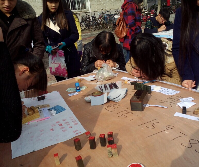 比赛现场,同学们聚精会神、胸有成竹,有的挥毫泼墨、飘逸洒脱,篆刻一笔一划、认真专注。一个个颇具神韵的书法和篆刻作品无不展现出对中国古老文化的向往。作品中有刚正不阿的楷书,有古色古香的隶书,有潇洒飘逸的行书。其中的优秀选手以一首《劝学》为题材,气韵浑然天成 妙趣匠心独具,深扣这次活动主题,笔法如春蚕吐丝,细密情致。评委们在比赛间隙给参赛选手悉心的指导和耐心的点评,赞其优益,指其不足,使同学们在此次比赛中获益匪浅。
