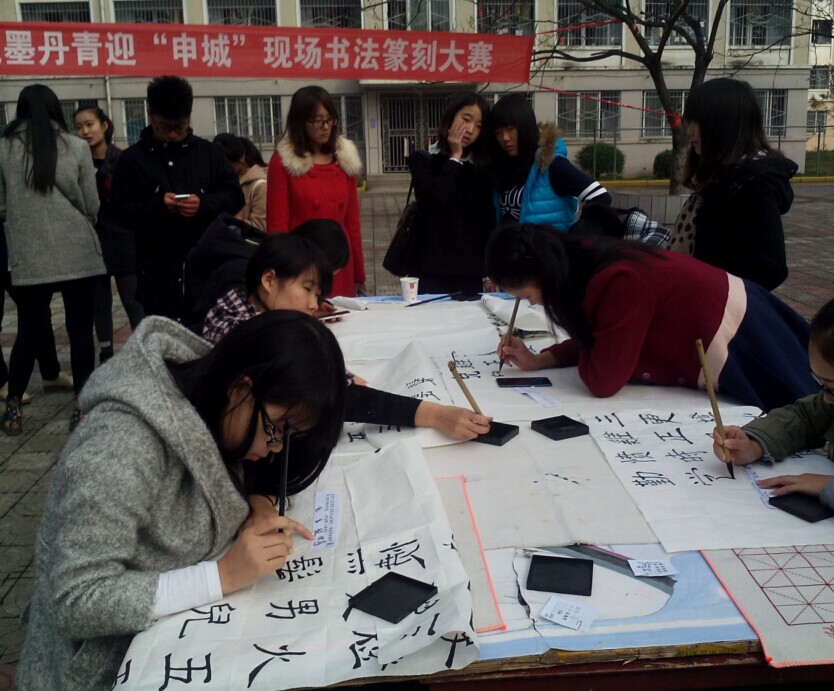 11月8日,在这阳光明媚,秋高气爽时节,八餐广场人声鼎沸,热闹非凡,由信阳师范公司老员工书法爱好者协会主办的笔墨丹青迎“申城”现场书法篆刻大赛在此拉开序幕。