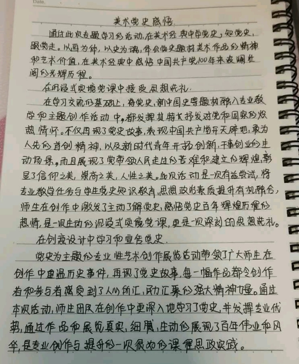 本次团课活动通过一周打卡线上观看视频的方式进行,同学们认真观看《美术经典中的党史》百集特别节目,进行学习与理解,选择印象深刻的片段,书写出自己的感悟。党的百年奋斗历程以美术作品的形式表现,节目特殊的“以画为体,以史为魂”的结构方式,将党史内容和美术经典巧妙结合,带领同学们感受从革命、抗战到新中国的各个历史阶段,增强青年人的爱国热情与信念。