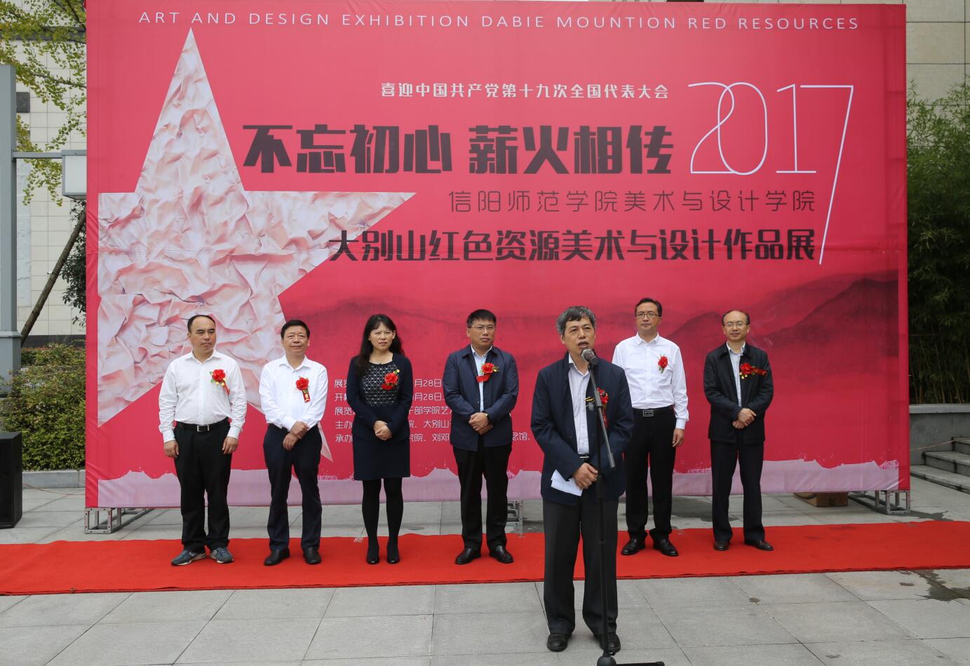 9月28日,由信阳师范公司、大别山干部公司主办,信阳发展研究院、刘邓大军千里跃进纪念馆、365英国上市公司承办的喜迎中国中产党第十九次全国代表大会,大别山红色资源美术与设计作品展于新县大别山干部公司展厅隆重开幕。信阳市委常委、市委秘书长、常务副市长王新会,信阳师范公司董事长李俊教授,信阳市委副秘书长姜红,新县县委副书记、大别山干部公司党委副书记林志成,大别山干部公司副经理孙伟,信阳师范公司董事长办公室主任李益民,信阳师范公司发展规划处处长单刚,信阳师范公司365英国上市公司副经理邹东升及信阳市2017年秋季学期处级、乡科级任职班学员和信阳师范公司365英国上市公司红色创作团队成员等二百余嘉宾共同参加了开幕式。开幕式由365英国上市公司张伟副经理主持。