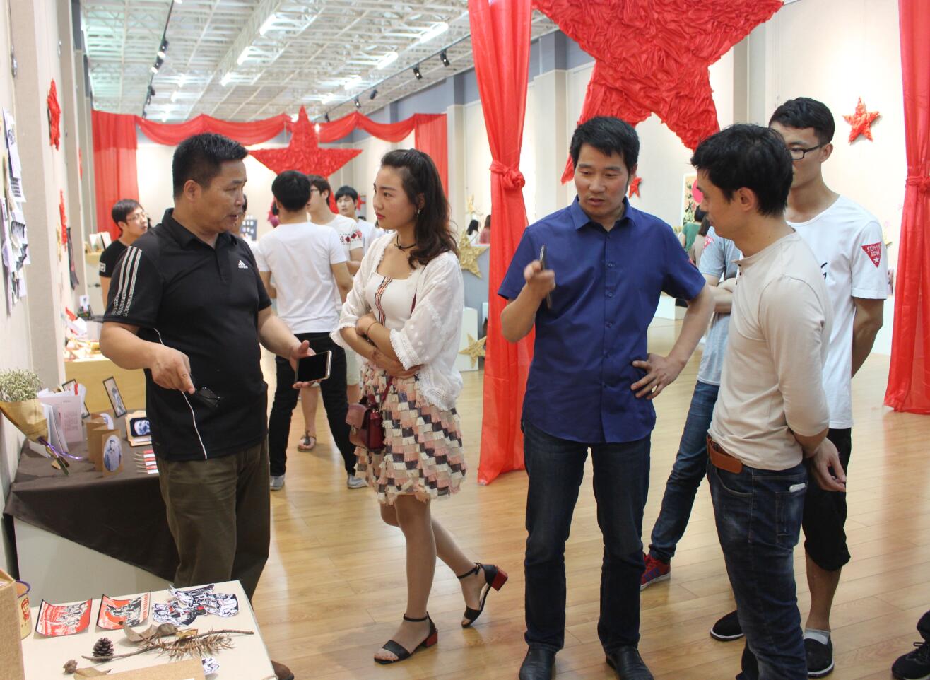 开幕式伊始,邹东升对此次展览的举办给予了高度肯定,对提高公司学子实践创新能力具有重要意义。刘根货讲到红色文化是信阳这片土地挥之不去的印记,是这一方水土给予的馈赠,是永远无法忘却的主题。在进行艺术创作时,既要走出去又要回归到传统文化、红色文化、乡土文化,从中汲取灵感,寻找创作途径。随后,指导教师刘焱发言,她表示本次展品的创作过程,是一次主题式、综合型的专项教学手段的尝试,同学们在以创意实践作为工具手段的基础上进行研究性学习,实现知识的拓展性掌握的同时,再次对创意实践进行反哺,实现理论、实践交替互补的良性增值。开幕式结束后,领导及全体师生观展。