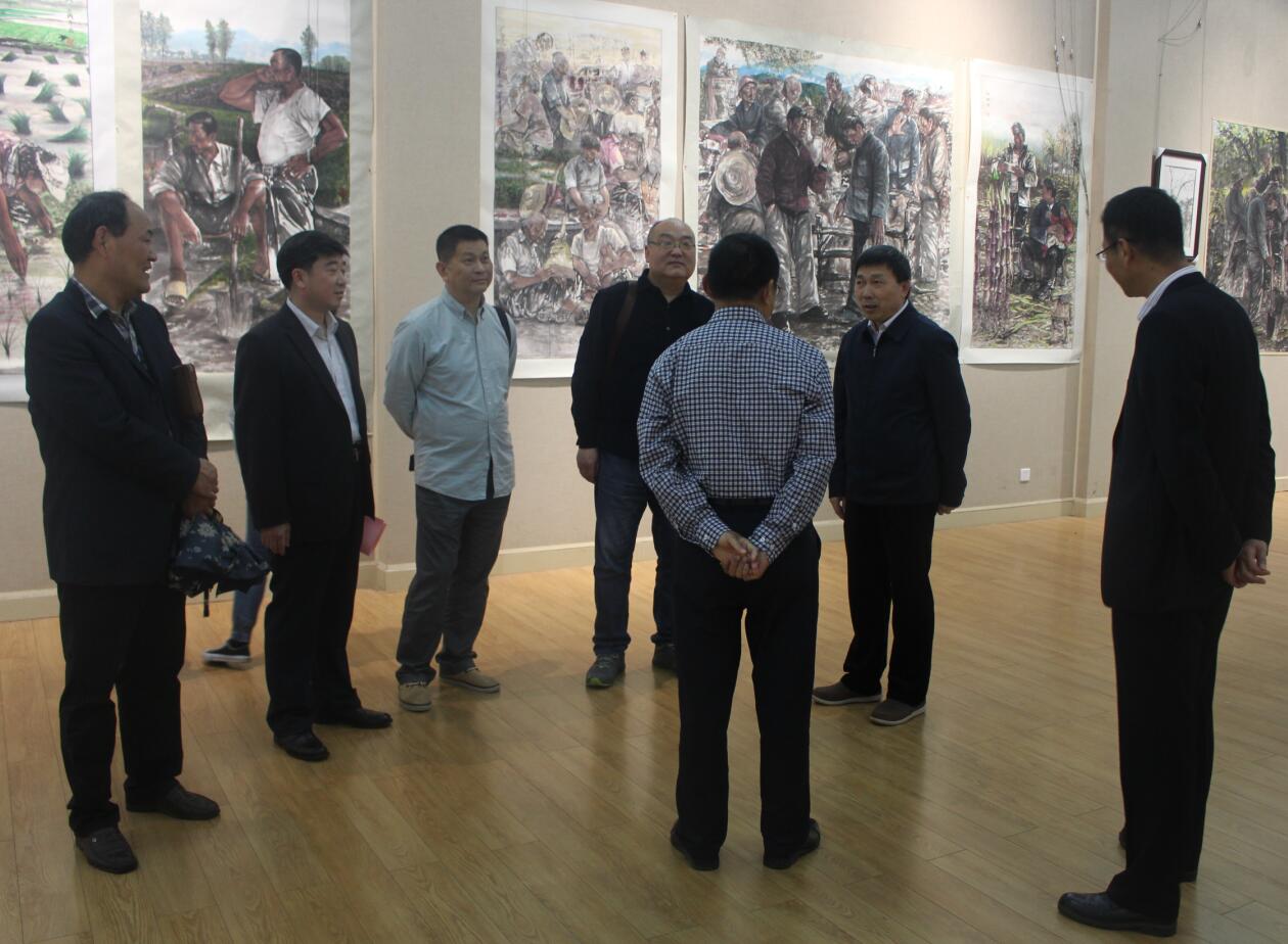 4月25日,信阳师范公司副董事长王文臣、招生处处长江玉安、文公司党委书记吴圣刚、人事处正处级调研员郭东及众多员工前来参观“乡土情”——潘正永美术作品展,公司领导老师与潘正永老师陪同观展。