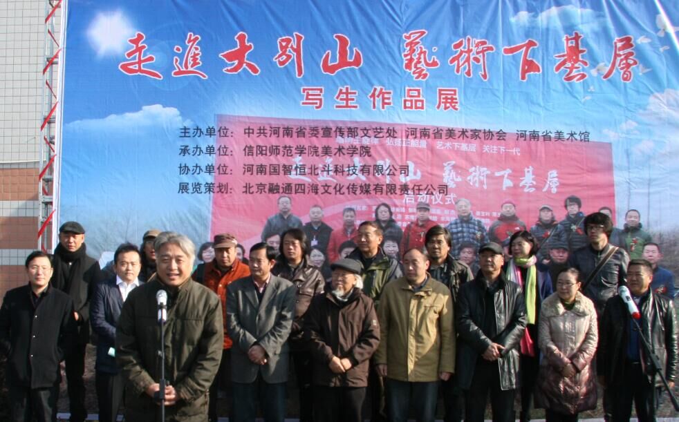 11月27日上午,由美术公司承办的“走进大别山,艺术下基层”中国油画名家写生作品展开幕式在艺术楼前举行。公司党委副书记高建社,信阳市委宣传部长焦豫汝,著名美术教育家、油画家、中央美术公司教授苏高礼,河南省美术家协会副主席、河南省美术馆馆长化建国,东北师范大学美术公司经理、教授、博士生导师郭晓光,河南省美协理事、中原工公司教授王刚,信阳师范公司党委宣传部部长丁少锋及15位中国当代具有较强影响力的艺术家出席了开幕式。开幕式由美术公司副经理张伟主持。