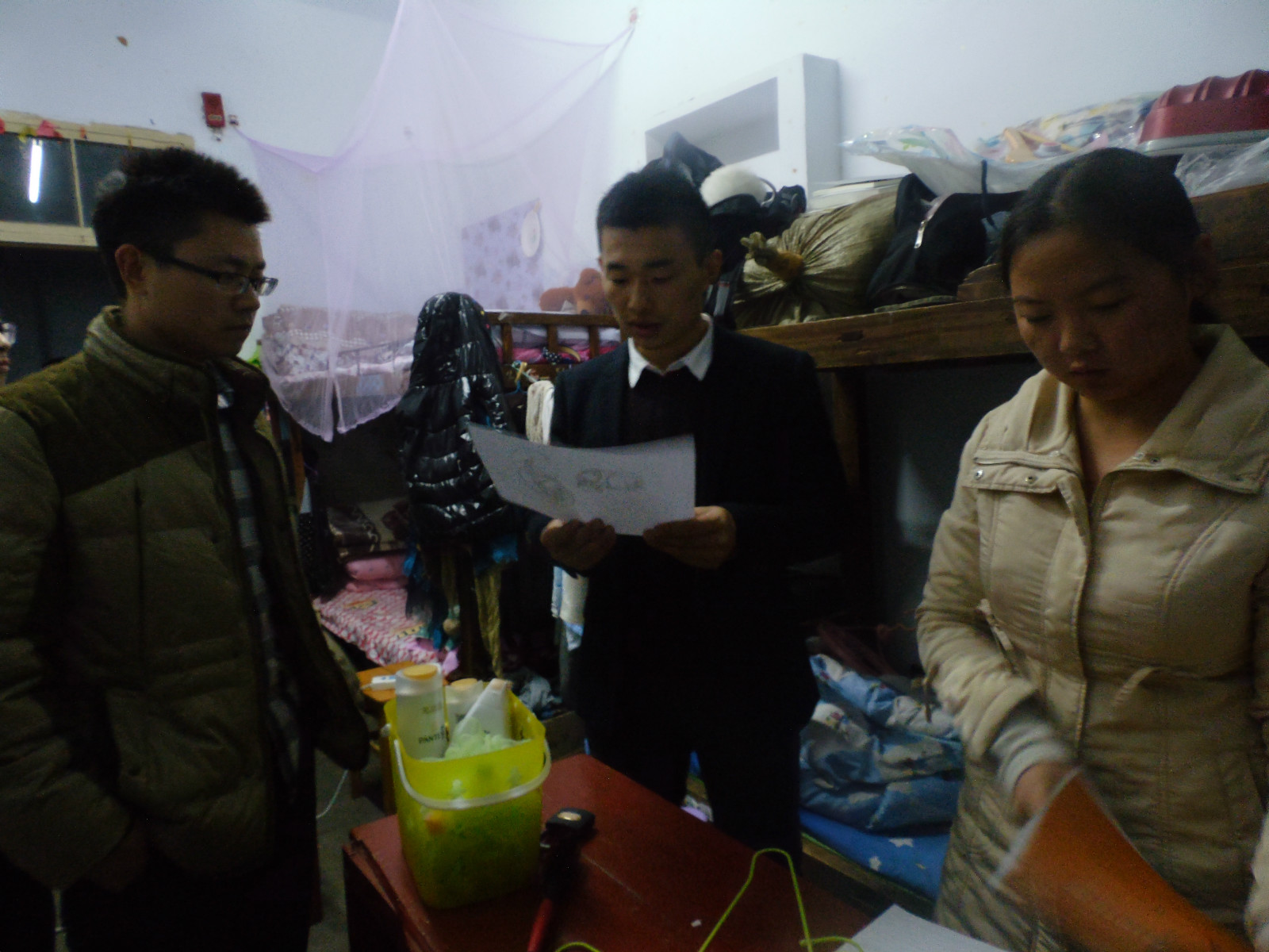 针对寝室实际情况,查寝过程中老师就安全用电、寝室通风等方面做了仔细检查,并积极宣传安全用电的知识。检查过程中,老师针对前段时间某公司员工摔倒导致脑死亡一事细心的提醒同学们在靠栏杆的一头睡觉以确保人身安全。临走前老师特别强调保持环境卫生不仅能体现干净整洁的形象更能优化生活氛围。