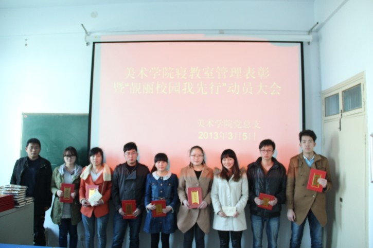 大会在热烈的掌声中开幕。美术公司党总支副书记李孝民首先宣读“信阳师范公司寝教室管理工作先进集体及个人”名单,公司党总支书记周子良依次为2012年寝教室管理先进班集体、寝教室管理文明教室班级代表、寝教室管理先进个人、文明寝室代表、优秀寝室长颁发了荣誉证书和奖品。接着,周子良书记宣读“信阳师范公司文化进公寓获奖作品作者”名单,副经理张伟为文化进公寓获奖作品作者颁发荣誉证书和奖金。