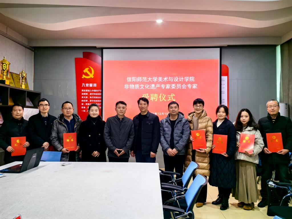 12月13日下午,应我院邀请,信阳市文广旅局非遗科科长王清丰、信阳市文化馆非遗保护部主任陈晶晶莅临美术与设计公司调研指导工作,并为公司非物质文化遗产专家委员会专家颁发聘书。公司领导班子、设计系主任、受聘专家及部分教师代表参加了会议。会议由视觉传达设计系主任刘焱主持。