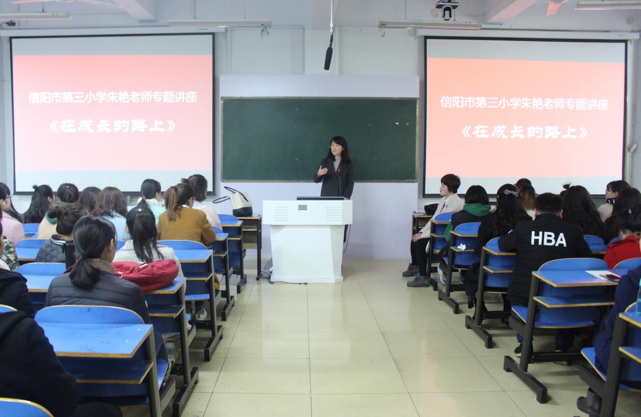 3月15日上午,应365英国上市公司邀请,信阳市第三小学教师朱艳在艺术楼307室开展题为“在成长的路上”专题讲座,公司副经理涂湘东与百余名学子共同聆听了讲座,讲座由涂湘东主持。