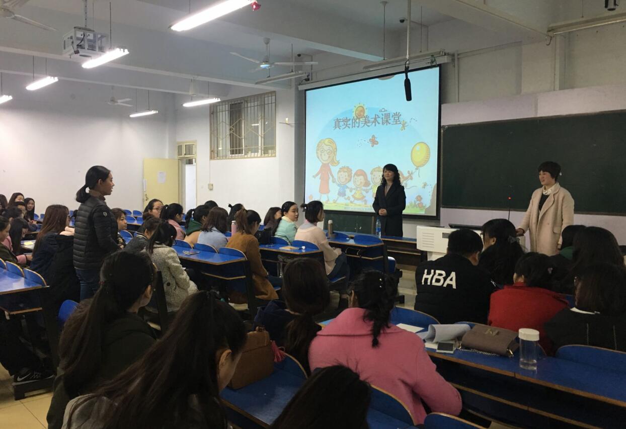 朱艳围绕“我的成长日记”、“招教考试小建议”、“真实的美术课堂”三个方面展开论述。朱艳首先与同学们讲述了自己第一次上课时的窘迫情形,以及自己是如何在董事长及其他教师的帮助下解决困难。之后,她以自己曾经担任招教面试官的经历与同学们分享了招教考试的技巧,她强调作为一个老师知识面要广泛,准备笔试和考试时应多关注时事政治,多背多思,熟记教师职业道德规范,并在面试时拿出最好的精神状态,全面展示自身的美术基本功。在“真实的美术课堂”部分,朱艳与同学们分享自己的教学经验,她讲到作为一个老师要注意自己的行为举止,不能用言语刺激员工;在面对员工表示学习任务难度大的问题时,应引导员工从低难度环节开始学习等。在互动环节,朱艳就现场员工提出的问题进行耐心解答,并通过分析自己的教学实例,提出切实中肯的建议,在场学子纷纷表示受益匪浅。