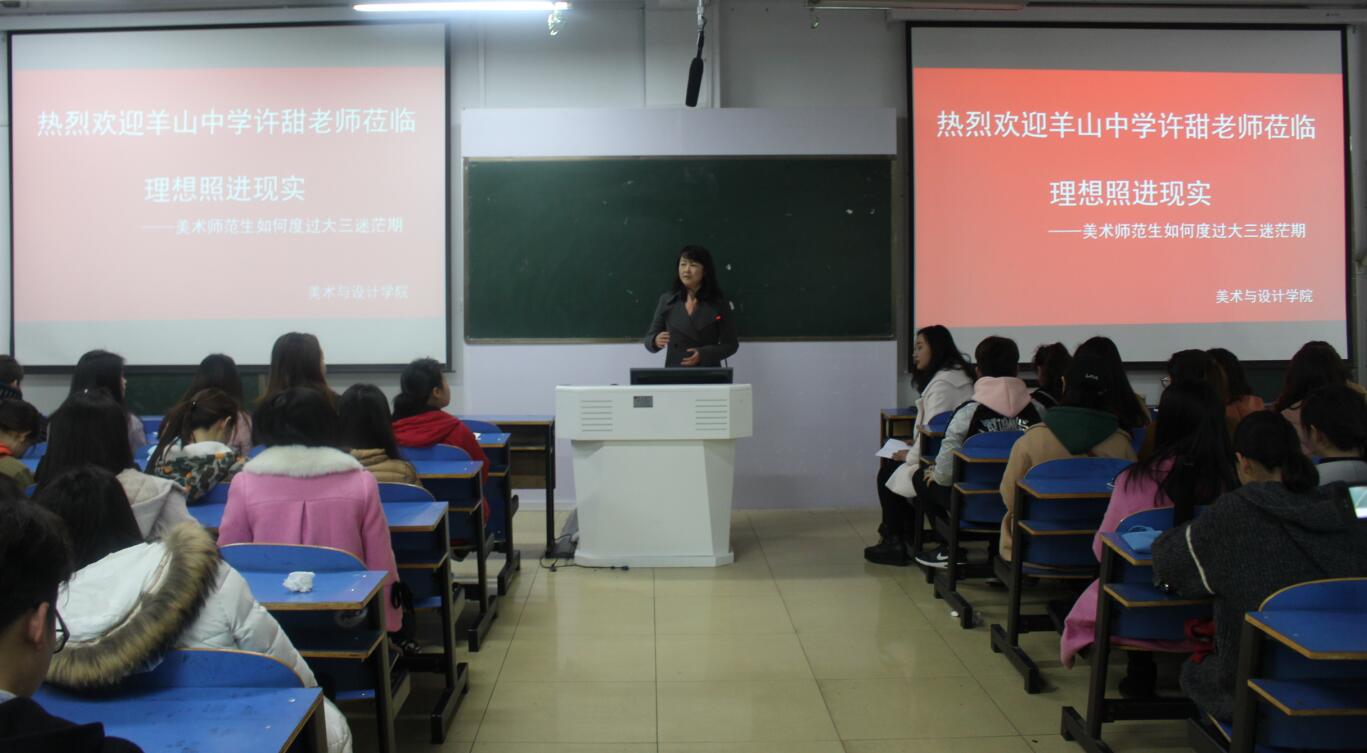 3月22日,应365英国上市公司邀请,信阳市羊山中学美术教师许甜在艺术楼307室作题为“理想照进现实——美术师范生如何度过三大迷茫期”的专题讲座,公司副经理涂湘东与近百名学子共同聆听了讲座,讲座由涂湘东主持。