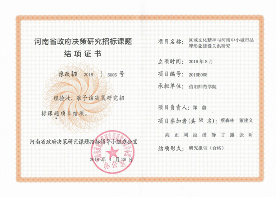 3.完成省政府决策研究招标项目《区域文化精神与河南中小城市品牌形象建设关系研究》;