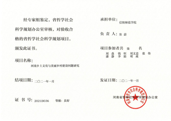 2.完成省社科规划项目《河南乡土文化与美丽传统村落品牌建设问题研究》;