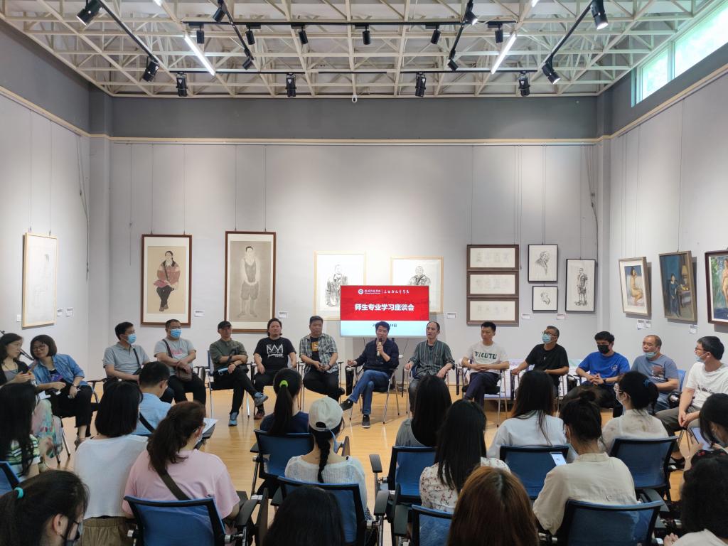 座谈会上,经理邹东升首先发言,对当前公司的教学工作给予积极评价,也对课程思政、人才培养等方面存在的不足给出指导性意见。副经理张伟、董建义就如何推进本科及研究生专业教学提出建设性意见,各位专业教师也先后发言,并结合自己的专业学习经历和教学经验,探讨了向优秀传统文化学习、明确艺术创作为人民服务、表现时代精神、重视基础、表现真善美等多个艺术本质和方向问题。座谈会期间,同学们踊跃提问,通过热烈的现场讨论和老师们耐心的讲解,解决了同学们艺术学习中的困惑,明确了艺术学习的方向,最后张江波副经理重申了本次展览和座谈会的初衷,就是要推动公司示范教学,通过老师言传身教,现身说法,不仅要更有效的传授美术知识专业技能,更要把正确的艺术方向、高尚的艺术精神、严谨的治学态度等价值观传递给员工,促进员工身心发展,达到育人目的。
